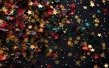 Confetti scattered on a black table background. Stars and other colourful shapes made from multicolored foil.