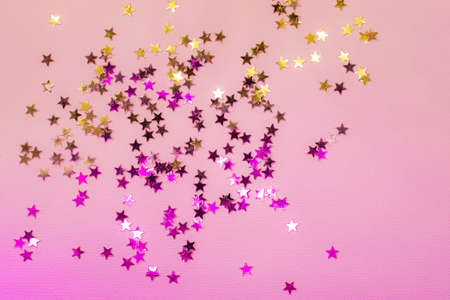 Glitter stars on pink background. Festive holiday pastel backdrop.