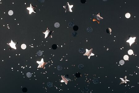 Black festive background with silver sparkles and stars. Flat lay style
