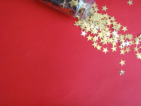 sequin stars on a red background for the New Year's decoration and a copy space in the center