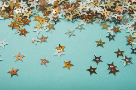 golden confetti stars on blue background top view