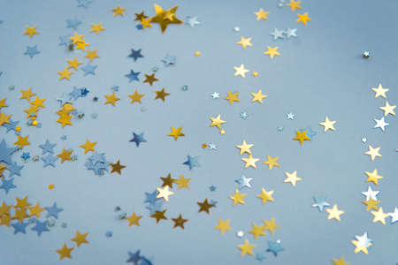 Abstract festive background with holographic sparkling stars confetti on dark blue background. Christmas, New Year or birthday party background for your project. Selective focus