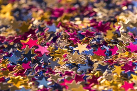 Colorful glitter stars on a black background. Shallow depth of field.