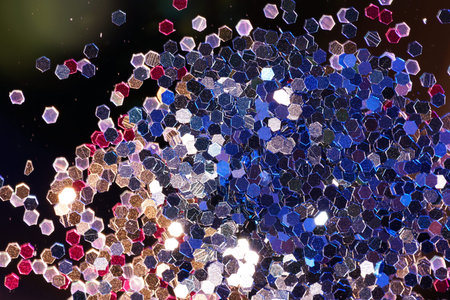 Gold and silver confetti on a black festive background.