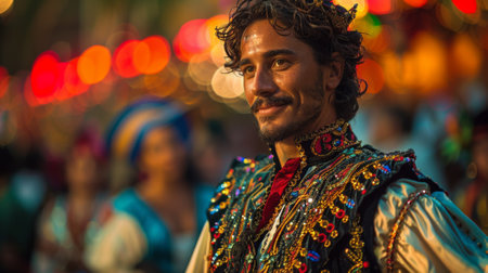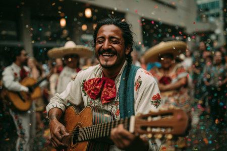 Joyful male guitarist in traditional clothing performs at a lively celebration, surrounded by confetti and an enthusiastic crowd, showcasing cultural vibrancy and community connection