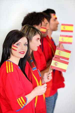 Happy smiling female Spanish supporter or fan displaying the national flag of Spain as she cheers on her country or team during a competitive event