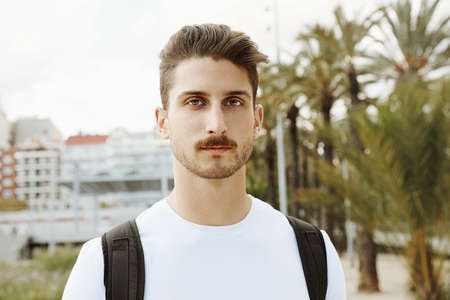 Outdoors portrait of handsome caucasian young man with sweet smile. Posing for the camera with natural beauty and Natural light. Real People, self care, fashion and lifestyle concept