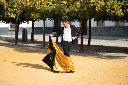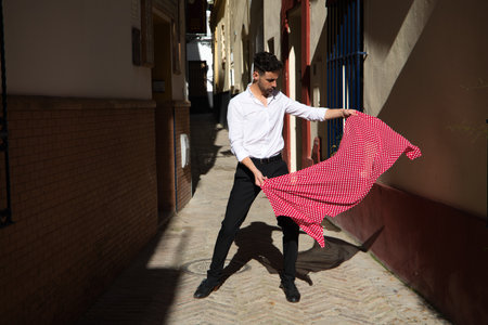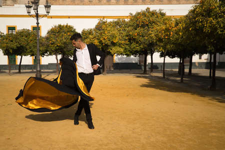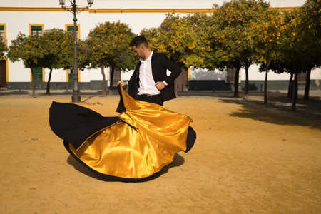 Portrait of young and handsome gipsy man, dressed in black and red shoes dancing with a black and yellow bullfighter's cape in the streets of Seville. Flemish cultural heritage of humanity.