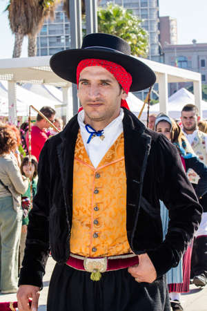 A man in traditional holiday clothes, in a hat and with a beer in his hand at the spring festival of Bando de la Huerta in Murcia, Spain, on April 23, 2019