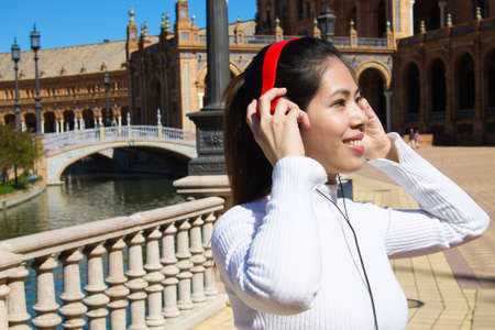 Beautiful young asian tourist. she is sitting on the stairs of a square while looking at the messages on her mobile phone
