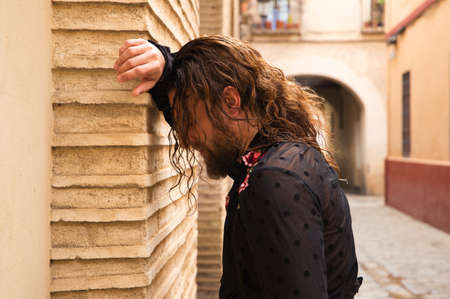 long-haired man dancing flamenco with black shirt and red roses rests his head on the wall of a typical narrow street of seville. Concept disappointment, depression, sadness, impotence, pain, passion.