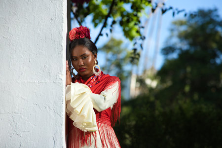 Young black woman in flamenco dress leaning on a column with bougainvilleas in a famous park next to the Plaza de España in Seville, Spain. She wears a beige dress with ruffles and red shawl