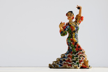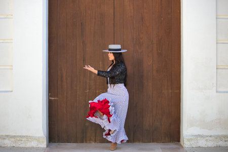Latin woman, young and beautiful dancing flamenco in front of a wooden door in a typical street of Andalusia. The woman is dressed in a white ruffled dress with black polka dots, a hat and a jacket