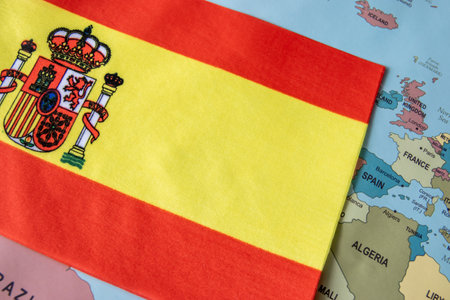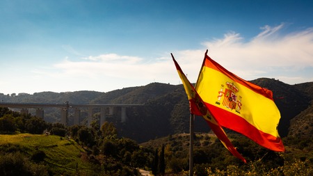 Spanish flag waving in wind. Flag of Spain on blue sky background. Empty copy space.