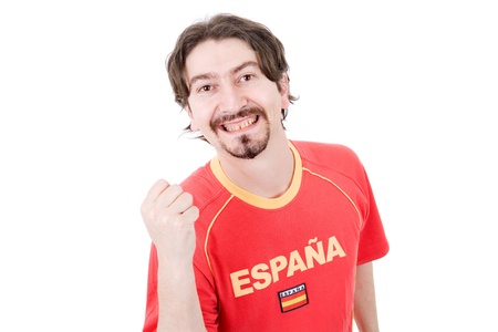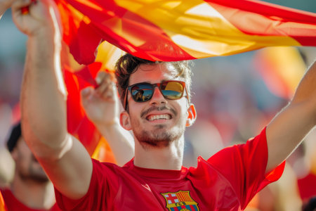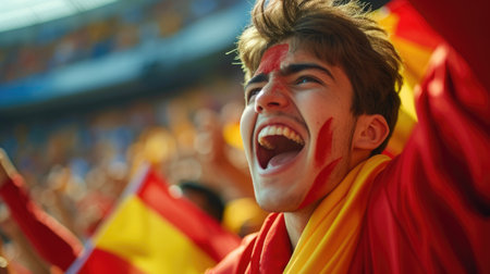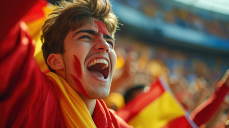 Excited spanish fan with face painted in flag colors cheering at stadium with text space.