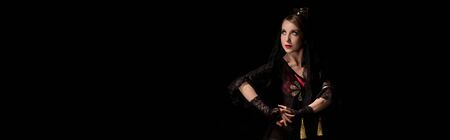 panoramic concept of pretty young flamenco dancer standing isolated on black