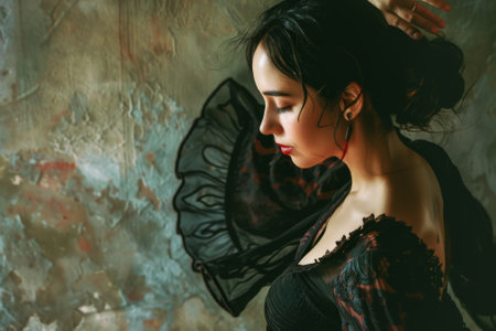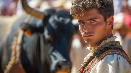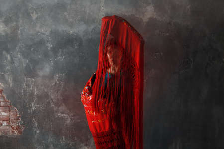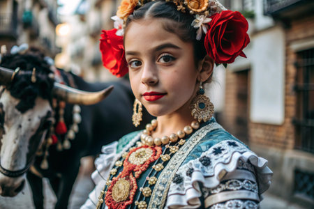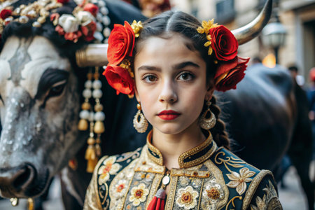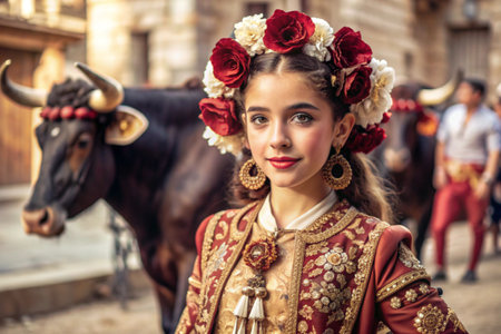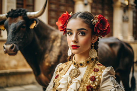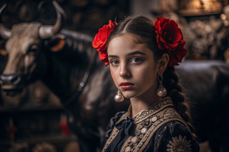 A Spanish girl in a traditional Spanish national costume. Against the background of a bull. Bullfighting. The portrait symbolizes the traditions and culture of the people of Spain.