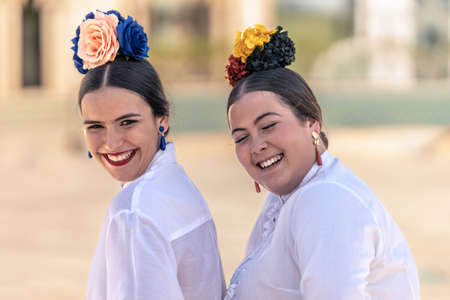portrait of two teenage girls in flamenco dresses laughing loudly