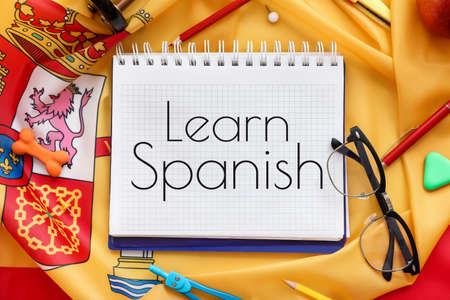Notebook with text LEARN SPANISH and stationery on flag of Spain