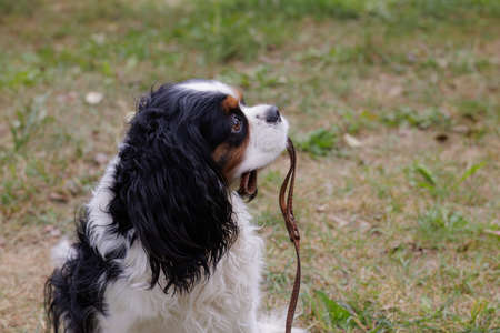 Cavalier King Charles spaniel holds a leash in his mouth in a green clearing.