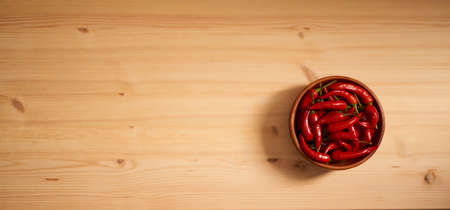 Very Hot Chili Peppers in Bowl on Rustic Wooden Background Top View. Red Spicy Chilli Peppers Pattern or Backdrop for the Indian Menu for Oriental Food Design