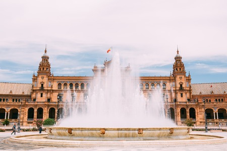 Plaza De Espana In Seville, Andalusia, Spain. Renaissance Revival Style. Spain Square. Fountain On Foreground