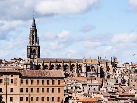 panoramic view on toledo medieval city with cathedral castle river spain