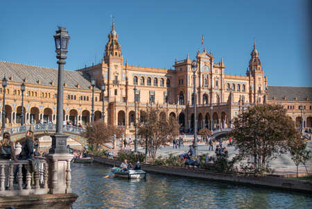 Seville, Spain - November 16, 2019: Sunny day in the Spain Square with boating people
