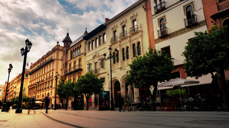 Seville, Spain - 10 February 2020 : Main Boulevard Street in Beautiful Seville Spain City Center