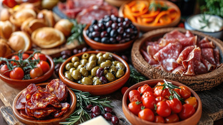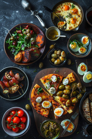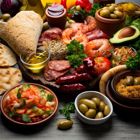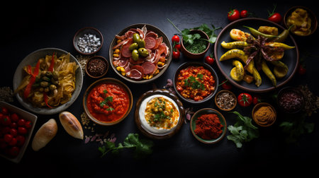 a variety of colorful tapas arranged on a mosaic table, created with generative ai