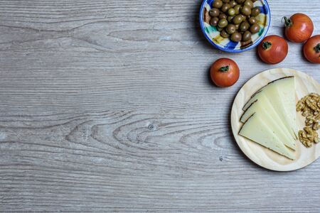 wooden table with dishes of spanish tapas of aged cheese and olives. Copy space on the left