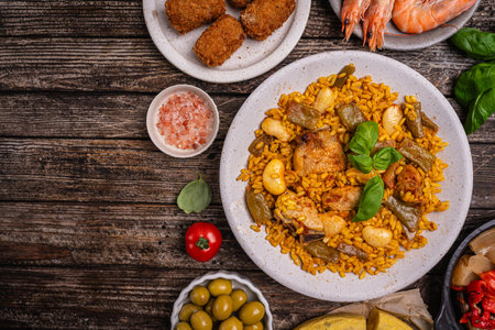 PAELLA with shrimps additionally served with bruschetta and Italian antipasto skewers with sausage. Spanish and Italian cuisine. Paella is a Spanish rice dish originally from Valencia.
