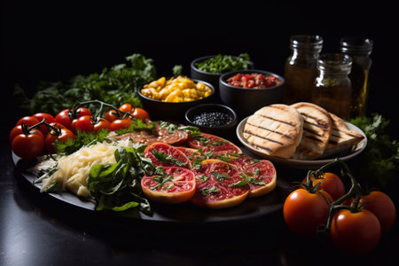 overhead view of sandwich ingredients arranged artistically, created with generative ai