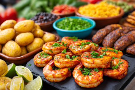 Grilled shrimp with fresh parsley and lime, alongside potatoes, beans, and sausages