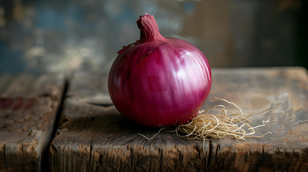 Close up of a fresh red onion on a rustic wooden table