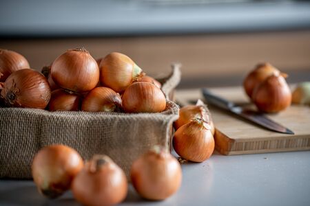 Fresh ripe onions on table in kitchen.