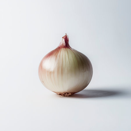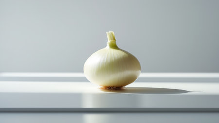 A single onion sitting on a white surface. AI generative image.
