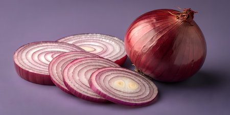 Whole red onion and neatly sliced pieces arranged on a purple background. Essential ingredient for many recipes. Distinctive color and texture for culinary presentations. Studio shot captures the beauty of red onion, ideal for cooking and food-related themes.