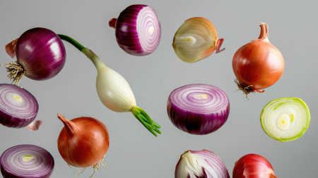 A visually striking arrangement of various types of onions showcasing their colors, shapes, and textures, perfect for culinary inspiration and healthy eating concepts.