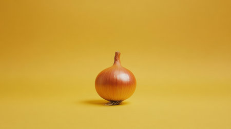 A fresh whole onion sits gracefully on a warm yellow backdrop, showcasing its smooth texture and natural shine. Ideal for food-related themes.