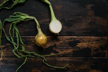 Organic onions with leaves on rustic wooden table. Food background. Bulb onions, green spring. Top view.