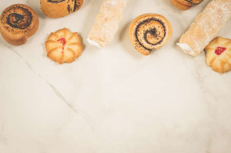 abundance of pastries on a white background/abundance of pastries on a white background, top view and copy space