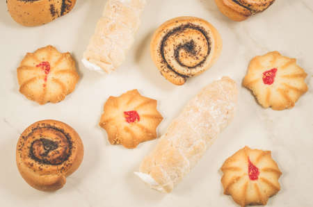 High resolution quality texture of cookies Side view of a variety of cookies. Background of the cookie in the studio. Group of various cookies. Concept of food and pastry products Horizontal photo.