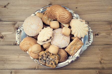 Assorted various cookies and muffins. Wooden combination plate on old boards table, close up