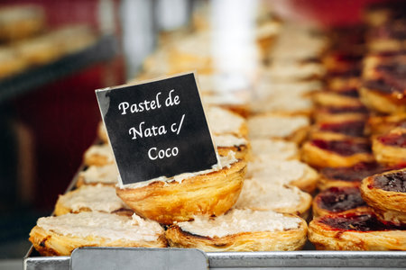 Fresh and appetizing Pastel de Nata com Coco in central Lisbon, a delicious coconut-flavored twist on the traditional Portuguese pastry