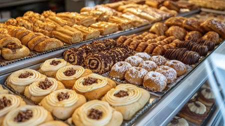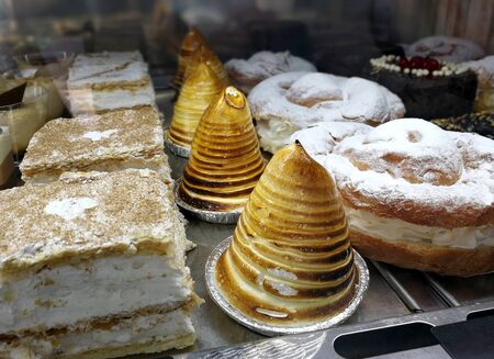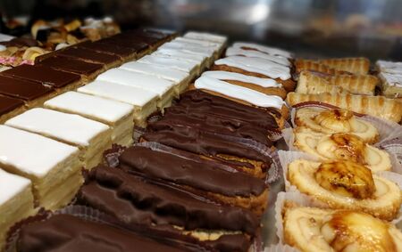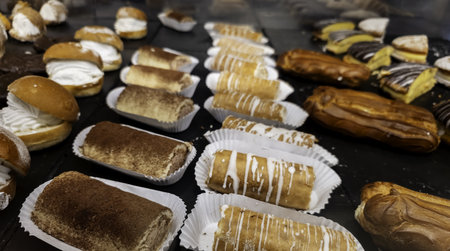 Snippet showcase pastry shop. A variety of fresh pastries. Close-up. Delicious and healthy range of bakery and bakery