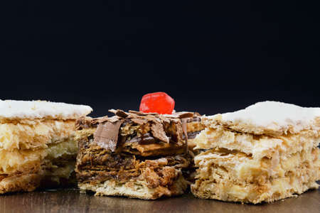 Puff pastry cakes with powdered sugar and cream and another with chocolate and a cherry on top on the wooden table. Close up and space for text. Selective focus.