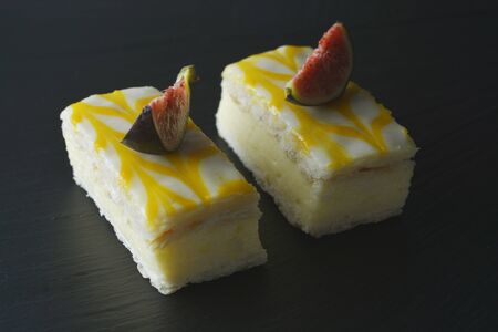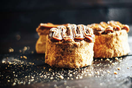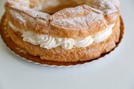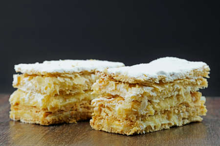 Puff pastry cakes with powdered sugar and cream on the wooden table. Close up and space for text. Selective focus.