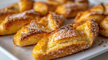 A delectable image of freshly baked sweet pastries glistening with sugar glaze, showcasing their flaky texture and golden crust, ideal for dessert enthusiasts.