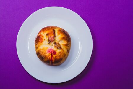 Delicious tortell (Coca de reyes) - ring shaped brioche decorated with sugared fruit and traditionally eaten in Catalonia during celebration of Epiphany